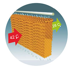• Không khí nóng đi qua tấm làm mát đã ướt thì xảy ra quá trình trao đổi nhiệt giữa nước và không khí tạo nên sự cân bằng. Do vậy, khí nóng đã hạ nhiệt và được đưa ra bên ngoài là một làn gió mát dịu, thoải mái cho không gian. Nhiệt độ không khí có thể giảm xuống đến 26 độ C vẫn đảm bảo sức khỏe cho người sử dụng.